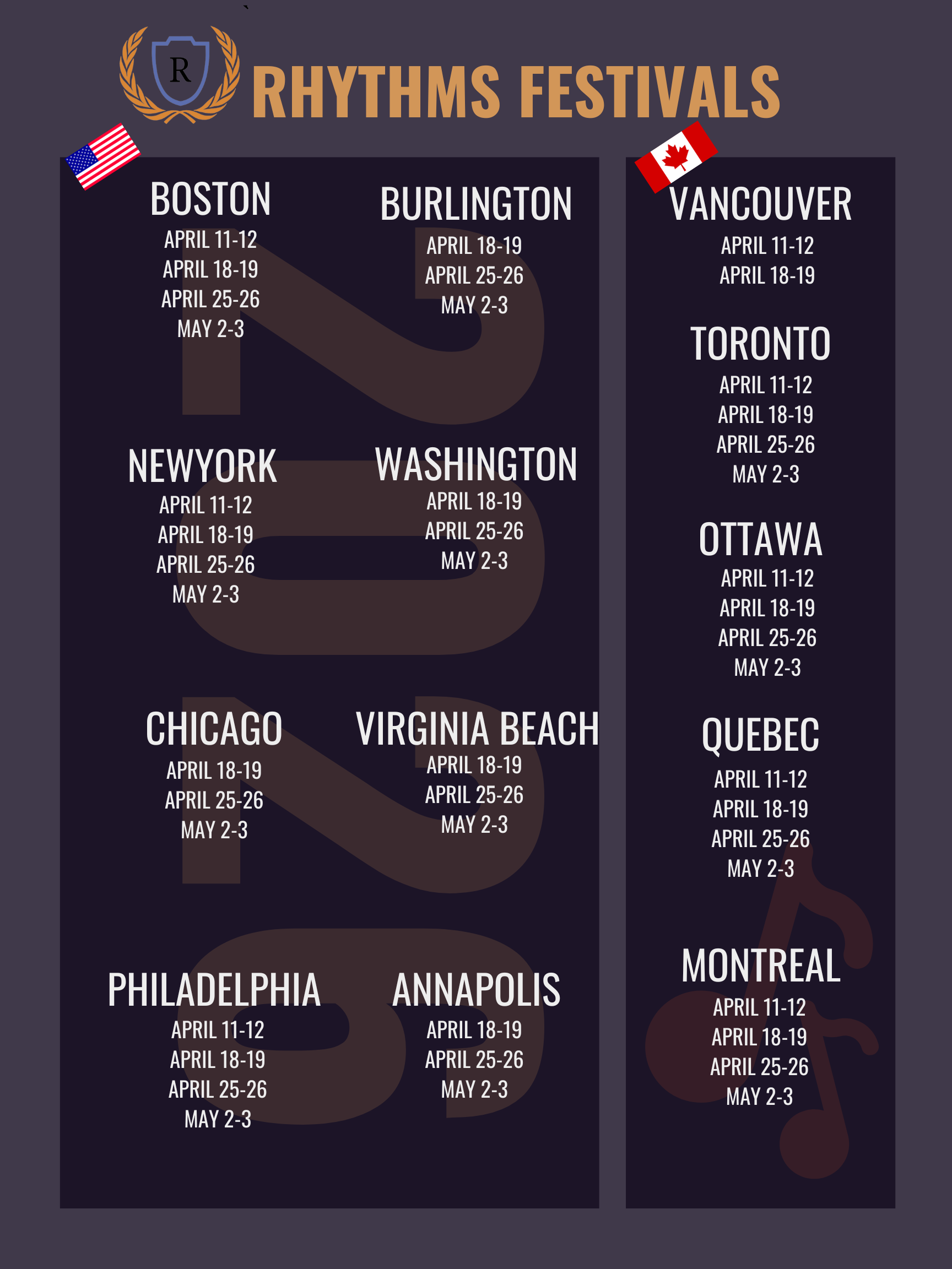 When you register for a Rhythms Festival you will register all of your various ensembles. Vocal groups, choirs, show choirs, color guards, orchestras, stage bands, senior and junior jazz bands, wind ensembles etc… We will also ask that you forward some information on the performing group itself and their director. Upon reception of your information we choose from our fine selection of adjudicators those best suited for each ensemble and schedule the judges for the event. You may register as many groups as you wish who will be traveling with you.